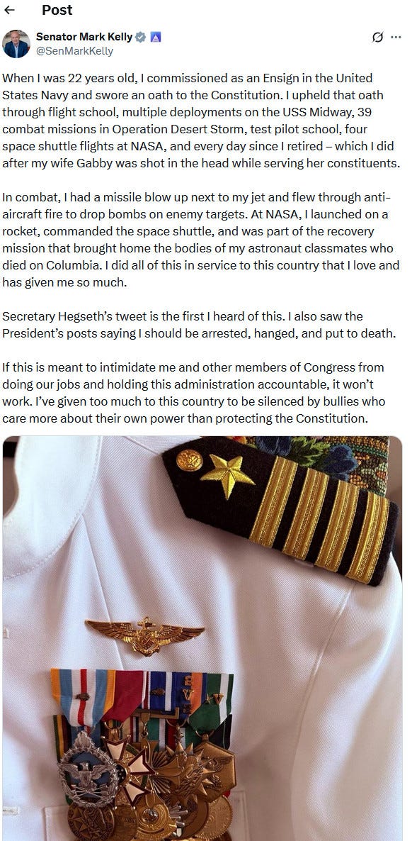 Mark Kelly wasn’t having it, appearing on several news shows to defend both himself and the others who made the video while directly calling out Hegseth for his bullshit.2