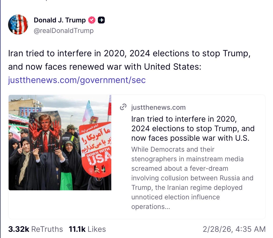 The Peace President did, however, use the attack as part of his ongoing assault on the constitution, bleating out a link to a conspiracy theory regarding Iran trying to interfere with the 2020 and 2024 elections.