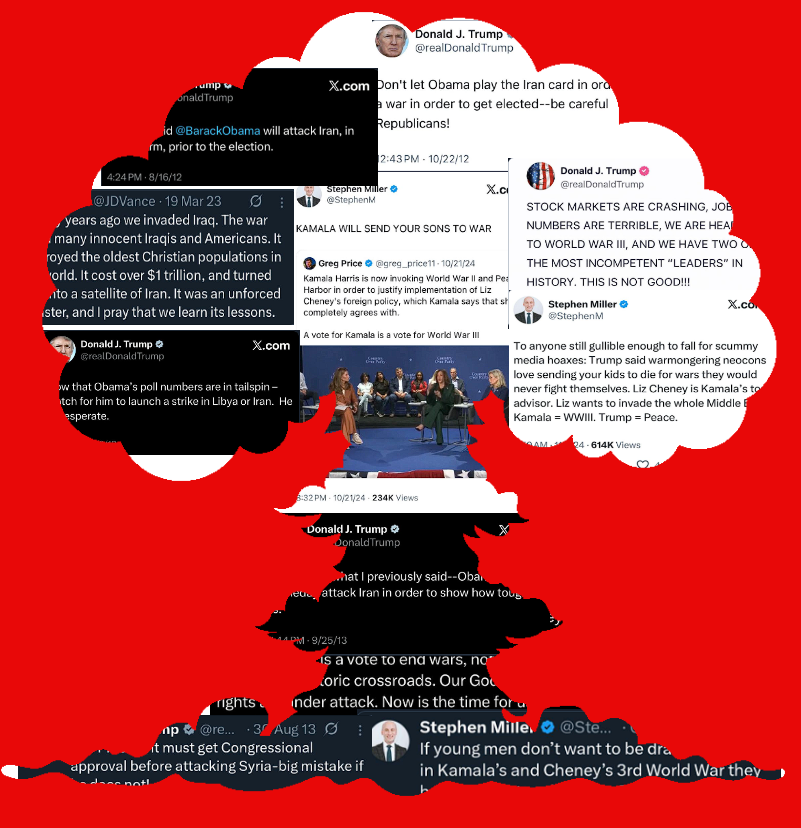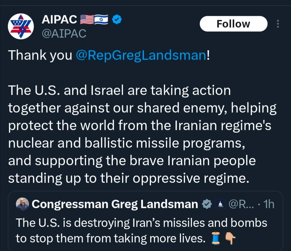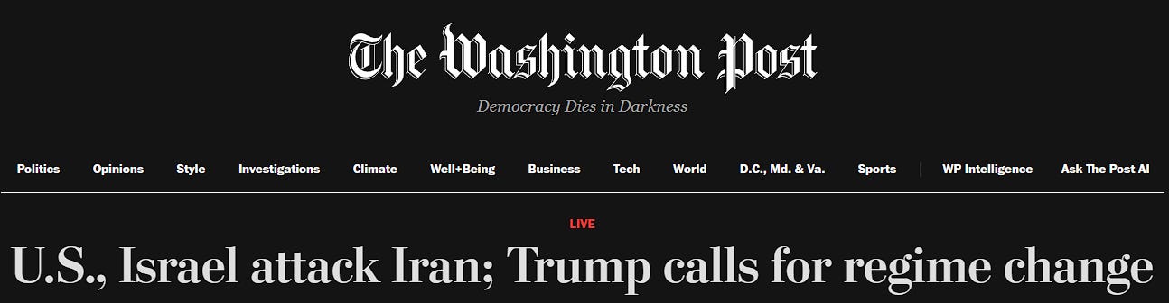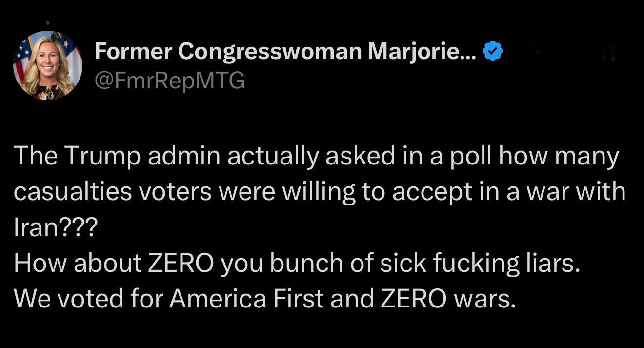 I do have hope that this attack backfires. Not that I want the Iranian regime to continue to oppress their own people, but because I fear that most will not see this as that which it so clearly, to me at least, is. A Wag the Dog distraction from the myriad failures of this admin domestically. Regardless of any potential military success, the attack is already being met with fierce criticism. Not only from Democrats (expected), but also from those who, up until now, were some of his fiercest supporters. To wit: