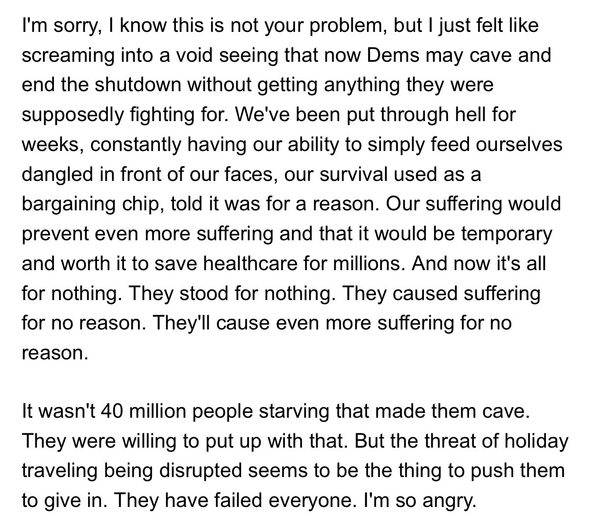 I simply cannot understand how the Democrats keep doing this. How do they continue to not realize that when your opponent is fucking themselves, let them. Don’t throw them a life preserver. There is a reason that the Cave Caucus was 4 retiring senators and 4 who aren’t up for reelection in 2026. This was calculated to avoid electoral damage so the Senators could get home for Thanksgiving. So, for those who think that somehow Chuck Schumer is absolved because he voted “no”, miss me with that. This has his fingerprints all over it. He needs to be primaried, as do the four Senators who aren’t retiring. The people need to let Democratic leadership know that we are no longer going to stand by while they crumble.